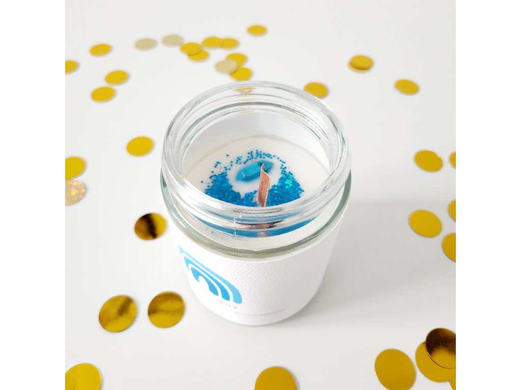 - Složení: 100% kokosový vosk (nevylučuje žádné škodlivé látky), dřevěný knot, třpytky, hexagon tyrkys.